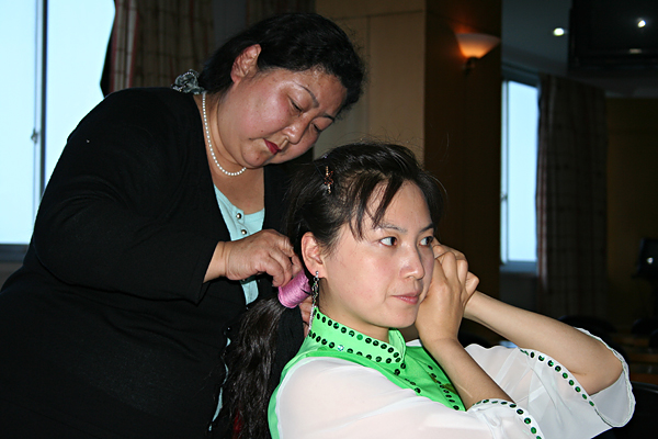 本次演出项目的组织者兼舞美指导居旦榕正在为演员们梳妆。大到项目策划、日程安排、聘请老师,小到租借服装、梳头、发卡、耳环,事无巨细,劳苦功高。