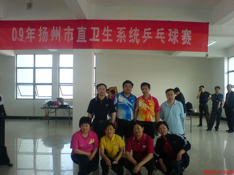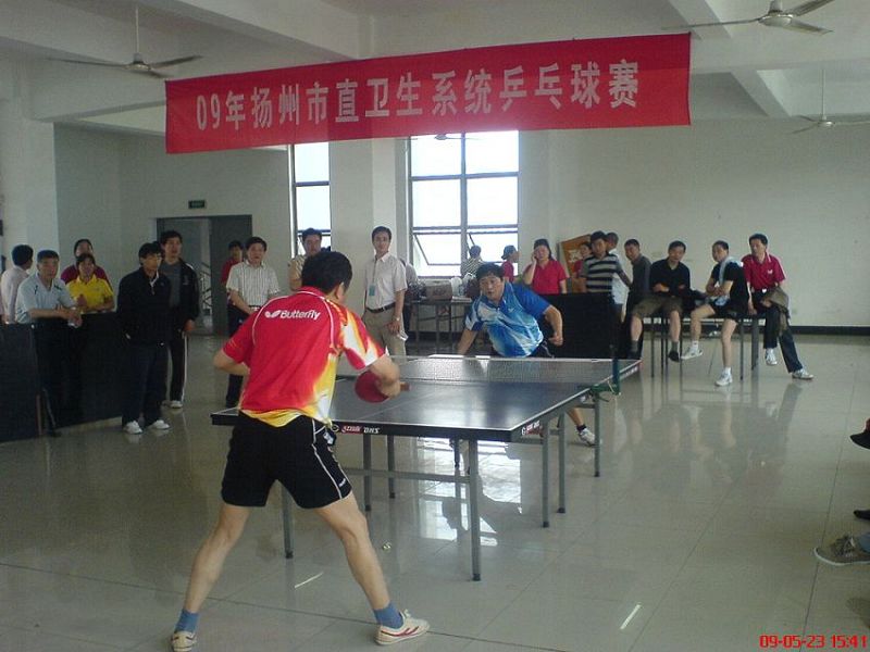 5月23日,扬州市卫生系统在职业大学(西校区)举办了第一届乒乓球比赛,设有男子单打和女子单打两项。时间从早晨8:10至晚18:00。 这次比赛高手较多,多场打得十分激烈和艰苦。在当天的比赛中,市疾控中心的男子单打队员胡建平和叶桦同志虽年龄偏大并带有伤痛,但他们仍以顽强的毅力和超负荷运动经过六轮八场的拼搏,先后淘汰多名对手,进入决赛,最终分别取得了冠亚军的骄人战绩。