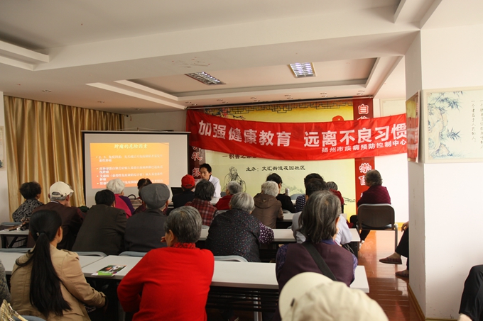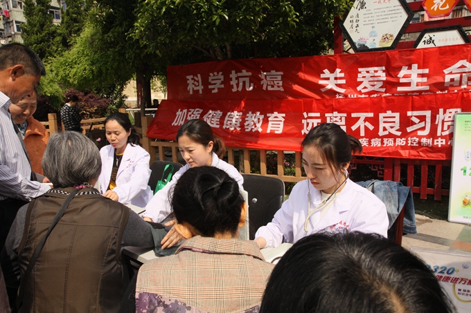 围绕“科学抗癌,关爱生命”“加强健康教育,远离不良习惯”的宣传主题,市疾控中心组织了10余名慢病专家开展展台和讲座宣传。疾控中心的慢病宣传员通过发放多种癌症相关宣传材料,向现场群众宣传了科学抗癌的相关知识,对大家癌症预防和健康生活方式等方面的咨询给予了详细的解答,并免费为在场群众测量血压。在社区健康室,市疾控中心慢病专家还为大家呈现了一场主题为“生活方式与肿瘤”的科普讲座,向居民宣传了癌症预防的相关知识,受到现场群众的热烈欢迎。