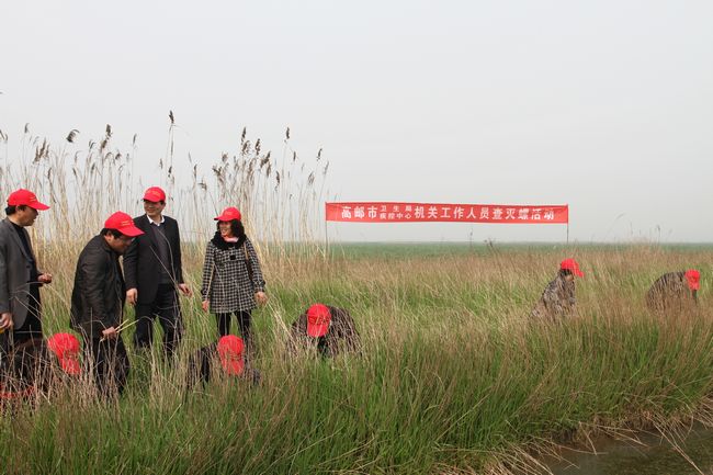 4月9日,高邮市卫生局组织全体机关工作人员,利用双休日深入新民滩开展查灭钉螺活动。