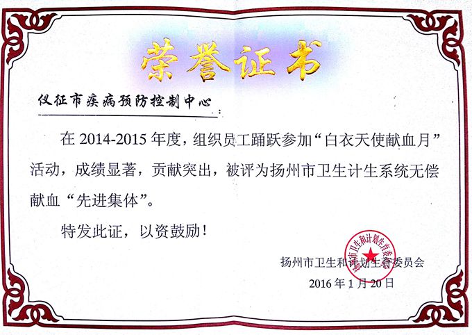2014-2015年度无偿献血“先进集体”荣誉称号,同时有6名同志被表彰为先进个人。