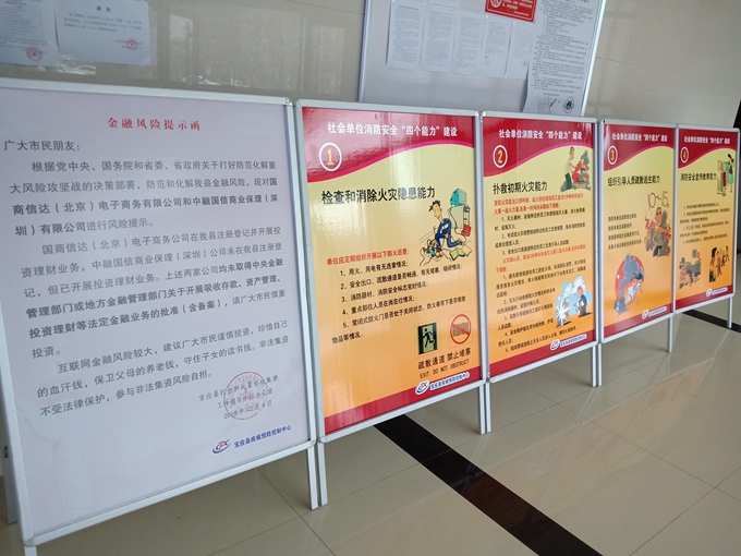 二是通过悬挂横幅1条、设置宣传戗牌5块、在中心大厅电子显示屏、电梯内等多途径广泛宣传安全生产、药品安全、社会治安、消防安全等各项安全防范工作,宣传禁毒禁赌等法规知识,传授各类识别诈骗行为的技巧和方法,引导广大群众增强自我保护意识和防范能力,提升群众安全防范意识。