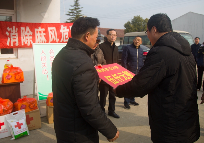 1月25日,第66届“世界防治麻风病日”暨第32届“中国麻风节”到来之际,扬州市卫计委、红会、疾控中心等部门领导在卫计委副主任王骏的带领导下,来到位于樊川镇圣禾村的江都区麻风病康复村,看望慰问寄养麻风病病人,江都区政府副区长闫冬梅及相关部门负责人陪同,送去了党和政府的温暖,并向他们致以节日的问候。目前,江都区麻风病康复村共有13名休养员,平均年龄77岁,都伴有不同程度的畸残。慰问人员察看了院内的设施、了解管理情况,询问生活状况,送上慰问金和大米、食用油等慰问品。走访中,王主任要求积极与民政部门沟通,用好用足相关政策,解决好病人大病费用的后顾之忧。闫区长强调要发挥民政、卫生相关政策的叠加效应,争取让每一位麻风病人感受到来自政府的关爱,让社会各界都来关注弱势群体。近年来,在党和政府的关心下,江都区麻风病康复村寄养麻风病人的生活条件和生活质量得到明显的改善,此次慰问使充分感受到了社会大家庭的温暖。