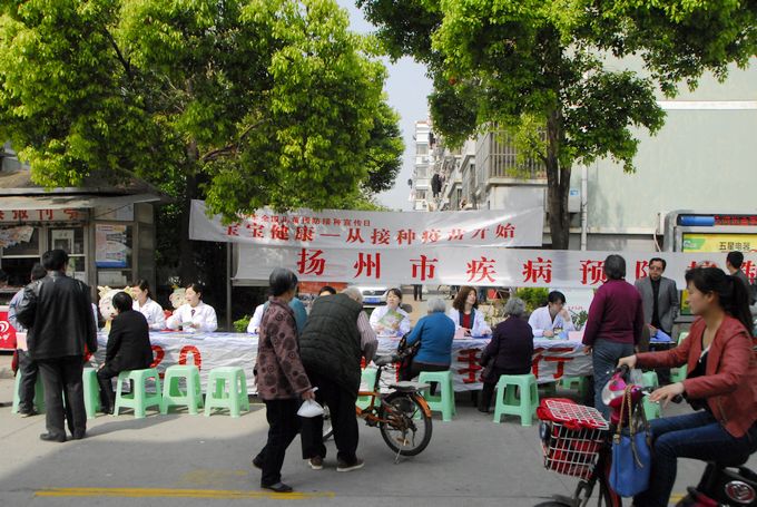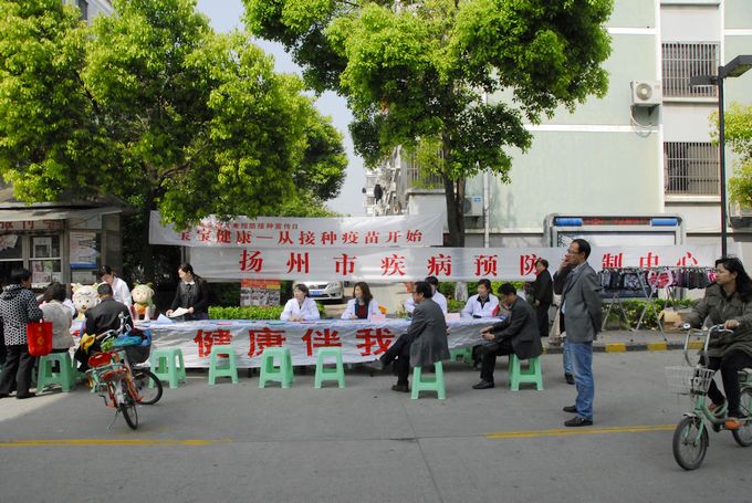 4月25日上午9:00,扬州市疾控中心联合邗江区、广陵区、开发区及邗江区邗上街道社区卫生服务中心免疫规划专业人员20余人,走进邗上街道五里社区,开展儿童预防接种相关知识的宣传、咨询、讲座活动,宣传活动共举办了预防接种业务讲座1场,悬挂横幅2条,展出了宣传展板10块,发放了宣传单1000多份、宣传小册子200多本、同时市疾控中心门诊部的专业医护人员还开展了12320的专题业务宣传和免费测量血压等活动,本次宣传活动扬州日报记者进行了现场采访和报道。市疾控中心朱道建副主任,开发区疾控中心何日主任和邗江区黄友副主任亲临现场参加宣传活动,同时本次宣传活动得到了五里社区的大力支持和配合。4月25日上午11:00,市疾控中心免疫规划科杨冬梅科长和中心门诊部吴蓓蓓主任受邀走进扬州广播电台“967 健康生活”栏目,进行了一期“宝宝健康——从接种疫苗开始”的专题直播节目,重点宣传和普及预防接种相关知识,同时现场接受了群众的电话咨询等。