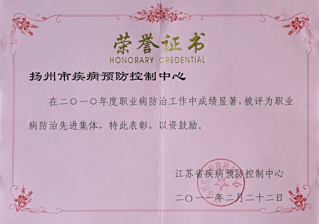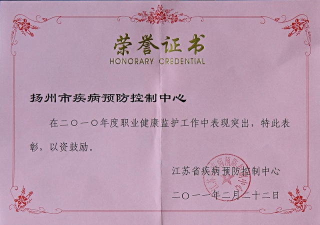 近年来,扬州市疾控中心坚持以科学发展观为指导,深入贯彻落实《职业病防治法》,按照市政府职业卫生工作会议精神和相关文件要求,认真履职、开拓进取、扎实工作,全力推进职业病防治工作的深入开展。通过不懈努力,本中心职业健康监护、职业病诊断、建设项目职业病危害评价、实验室质量控制、科研培训等多项工作取得突破性进展,有的工作在全省名列前茅。自2007年起,本中心已连续四年被省疾控中心表彰为全省职业病防治工作先进集体。在2010年11月份召开的全省职业卫生技术服务机构工作会议上,省卫生厅领导要求将“扬州经验”和“扬州做法”作为典型在全省推广。