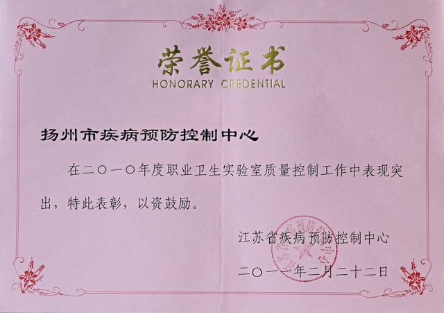 2728      2月22日,省疾控中心在南京召开了全省2011年度职业卫生工作年会,对2010度工作进行总结表彰。扬州市疾控中心荣获全省职业病防治先进集体、职业健康监护和实验室质量控制优秀奖等三项表彰,其中职业健康监护全省排名第一。同时,本中心朱月潜、江都市疾控中心王存毅等两人被授予职业病防治先进个人,宝应县疾控中心获得机构建设和实验室质量控制两个单项优秀奖。