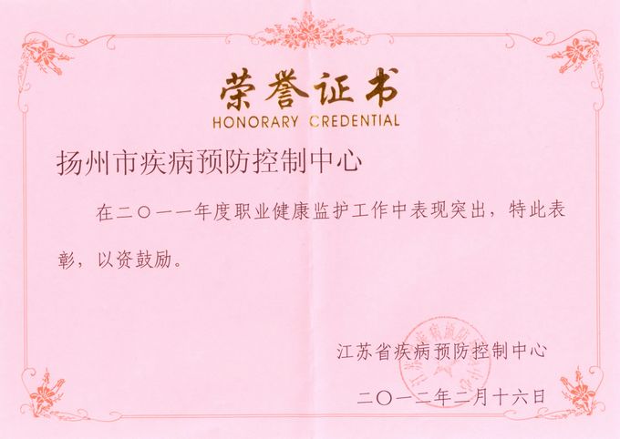 2月20至21日,从全省2012年度职业卫生工作年会上获悉,扬州市疾控中心荣获全省职业病防治工作综合先进集体(省辖市疾控中心仅6家受此表彰),另本中心职业健康监护获优秀奖并全省排名第一。本次获表彰的还有邗江区和仪征市疾控中心,分别获得了实验室质量控制和职业病哨点监测两个单项优秀奖,杨小平、吴斌、王存毅三位同志被授予职业病防治先进个人。