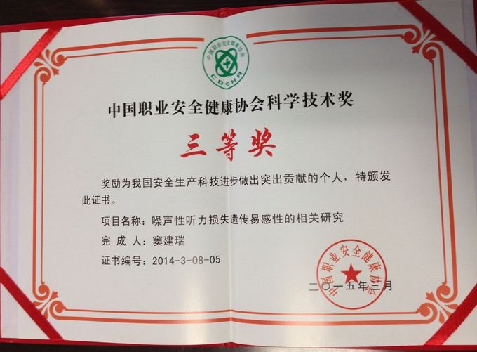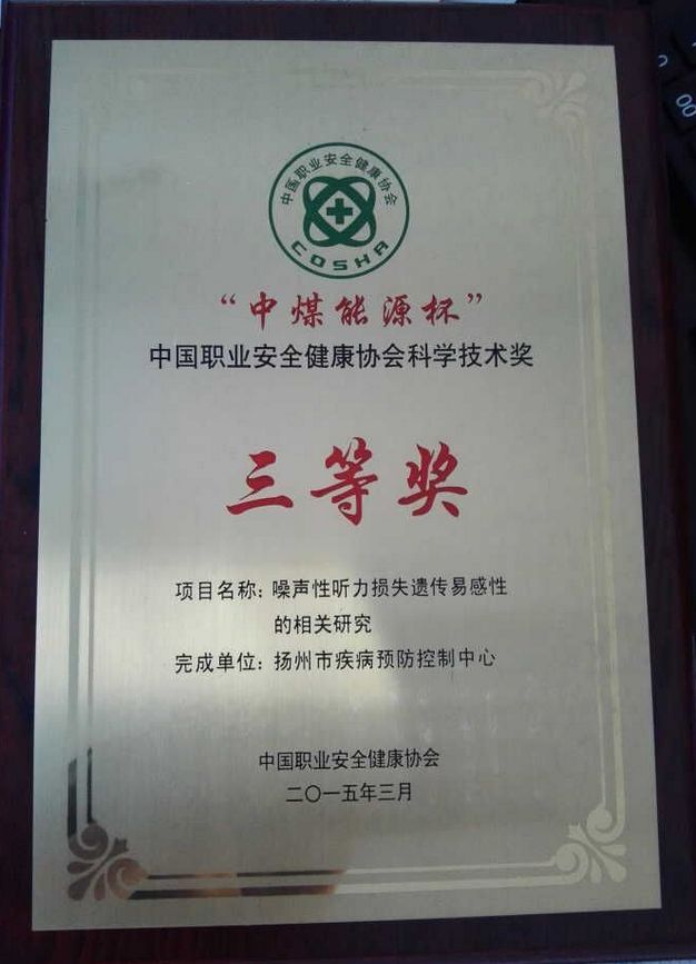 由我中心与江苏省疾病预防控制中心、昆山市疾病预防控制中心合作完成的《噪声性听力损失遗传易感性的相关研究》喜获 “中煤能源杯”中国职业安全健康协会科技进步三等奖。