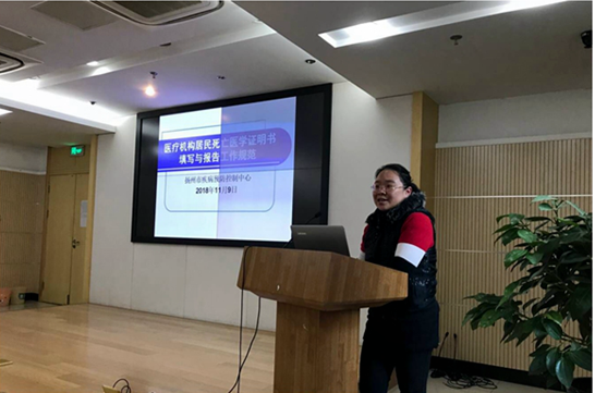 11月9日下午,扬州市疾控中心死因监测专业人员对苏北医院100余名医护人员进行了居民死亡医学证明书填写规范培训。