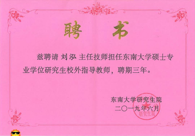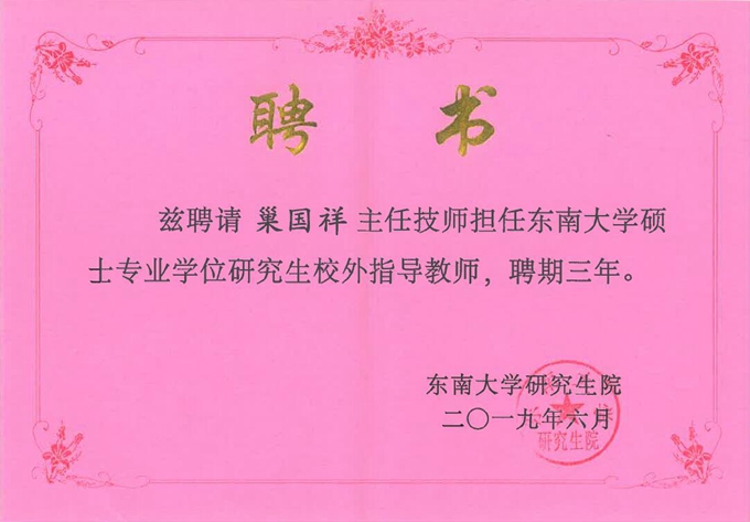 根据《东南大学审定专业学位研究生校外指导教师的实施办法》,经过中心初选,东南大学对申报人学历资质、业务能力、年龄等多方面进行综合考量,巢国祥、朱月潜、刘泓三人顺利通过初、复审和专家评议,于近日喜获“东南大学专业学位硕士研究生校外指导教师”聘书,聘期三年。他们将与校内教师合作指导专业学位研究生的实践技能和专业知识、共同制定研究生培养计划,并指导专业学位研究生完成学位论文。 东南大学自1996年3月经国家教委批准正式建立研究生院,是研究生教育与培养的重要基地之一。