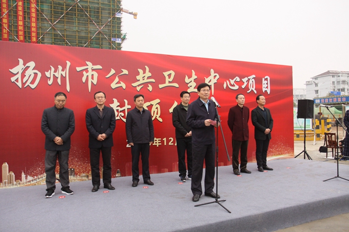 12月17日上午,扬州市公共卫生中心项目在建设现场举行了主体结构封顶仪式,市政府副市长余珽亲临仪式现场并宣布项目顺利封顶,赵国祥主任代表市卫健委致词,市疾病预防控制中心主任朱道健,书记吴奇鸿出席了封顶仪式。来自市卫健委和疾控中心的40余名干部职工代表现场观摩。