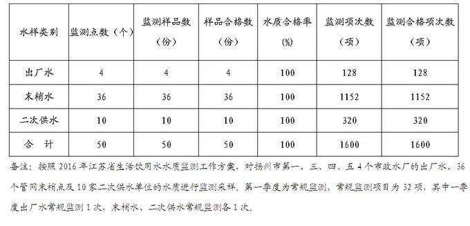 2016年一季度扬州市城市生活饮用水水质卫生监测情况统计表
