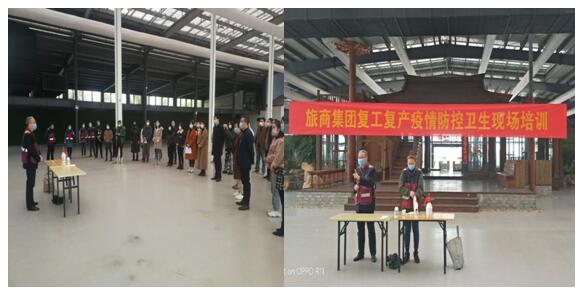 培训会上,驻景区疫情处置组组长朱月潜首先运用通俗易懂的语言通过旁征博引,声情并茂的方式从企业复工复产前后如何精准防控、如何规范应急处置等方面科学指导企业正确实施疫情防控措施及相关注意事项。其次,现场演示口罩正确穿戴方法,并通过专人操作专人讲解的模式向全体参会人员示范消毒的方法和穿脱防护服的关键点。最后,观摩旅商集团的应急演练,对临时留观室的设置及演练过程中存在的问题一一作了点评和技术指导。